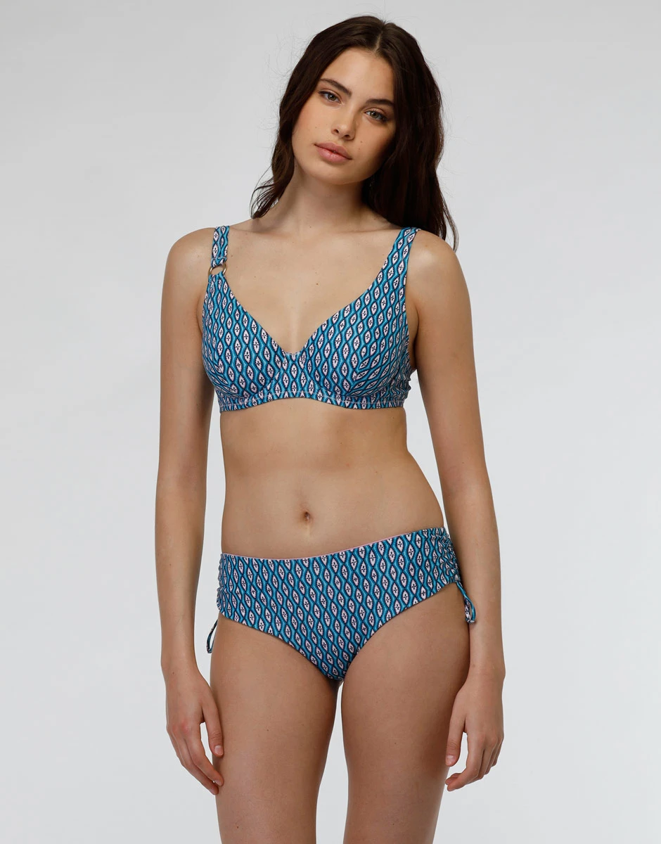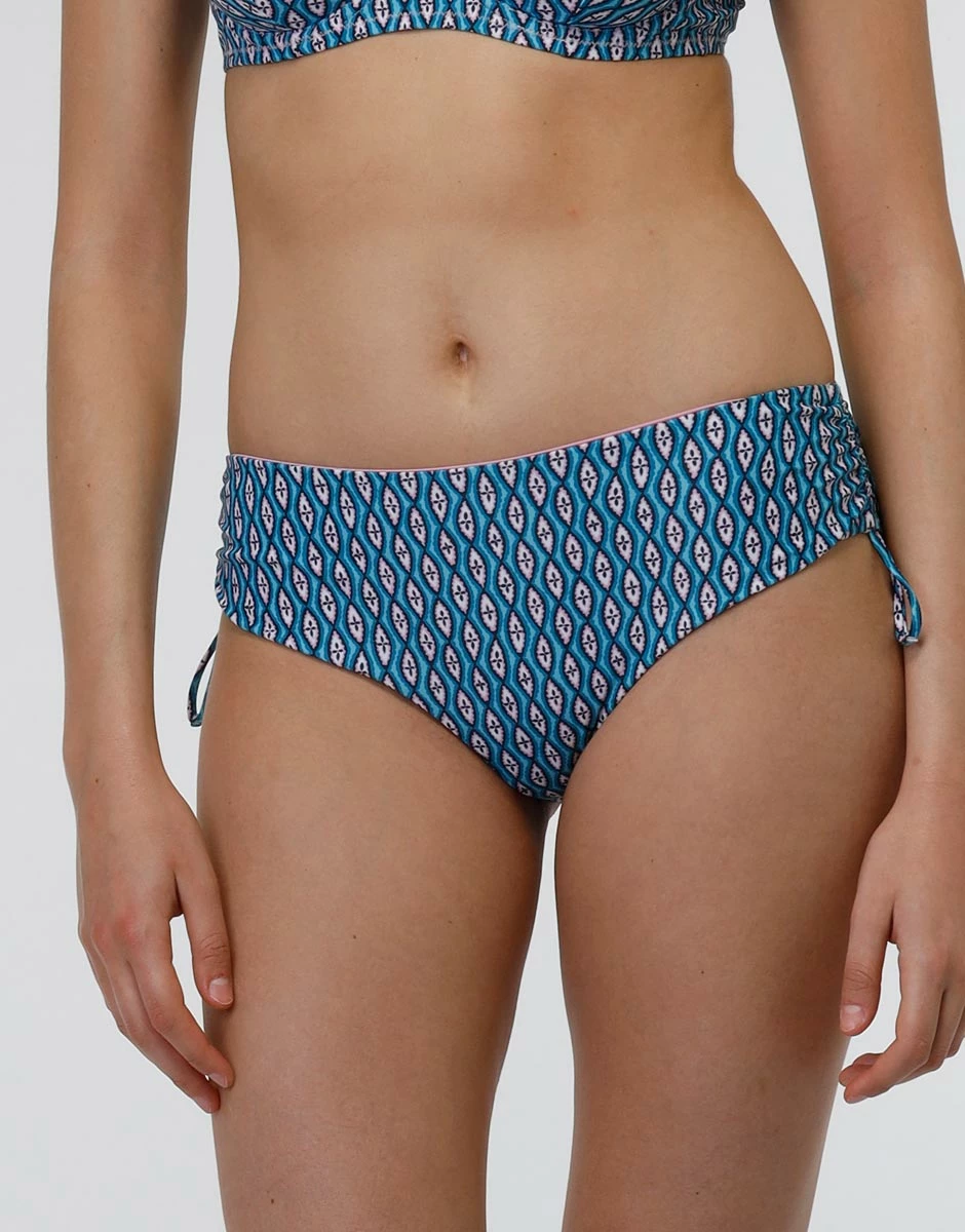Bas du maillot de bain en microfibre et nylon recyclé, deux matières qui garantissent aisance et confort au porter. Le slip taille haute est doublé sur le devant et le côté est réglable avec un cordon de serrage.