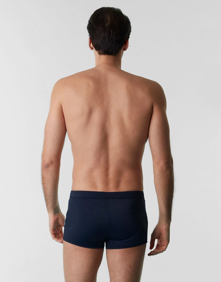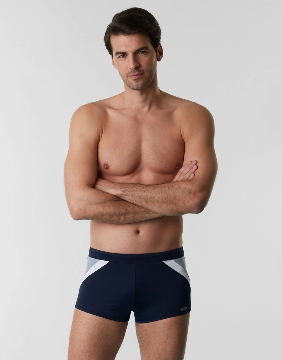 Maillot de bain avec fond bleu nuit et empiècements aux couleurs contrastées blanc et gris. Le cordon de serrage est intérieur et permet un porté confortable.
