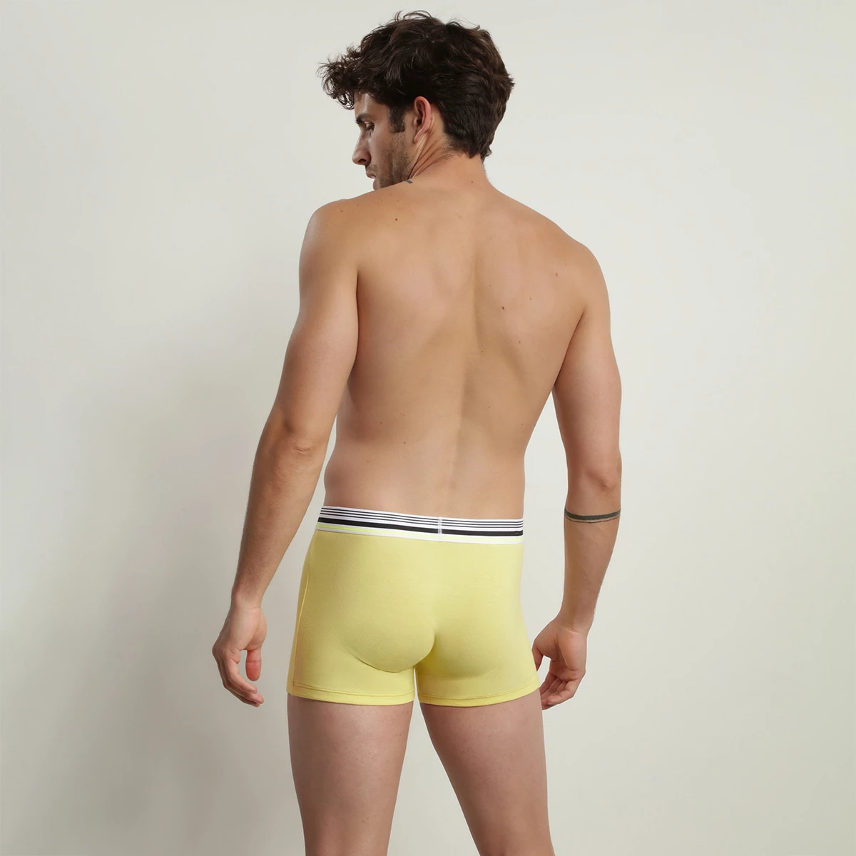 Votre lingerie est solaire et tonique avec notre boxer homme en coton modal piqué Dim Smart au coloris Jaune et à la ceinture rayée !