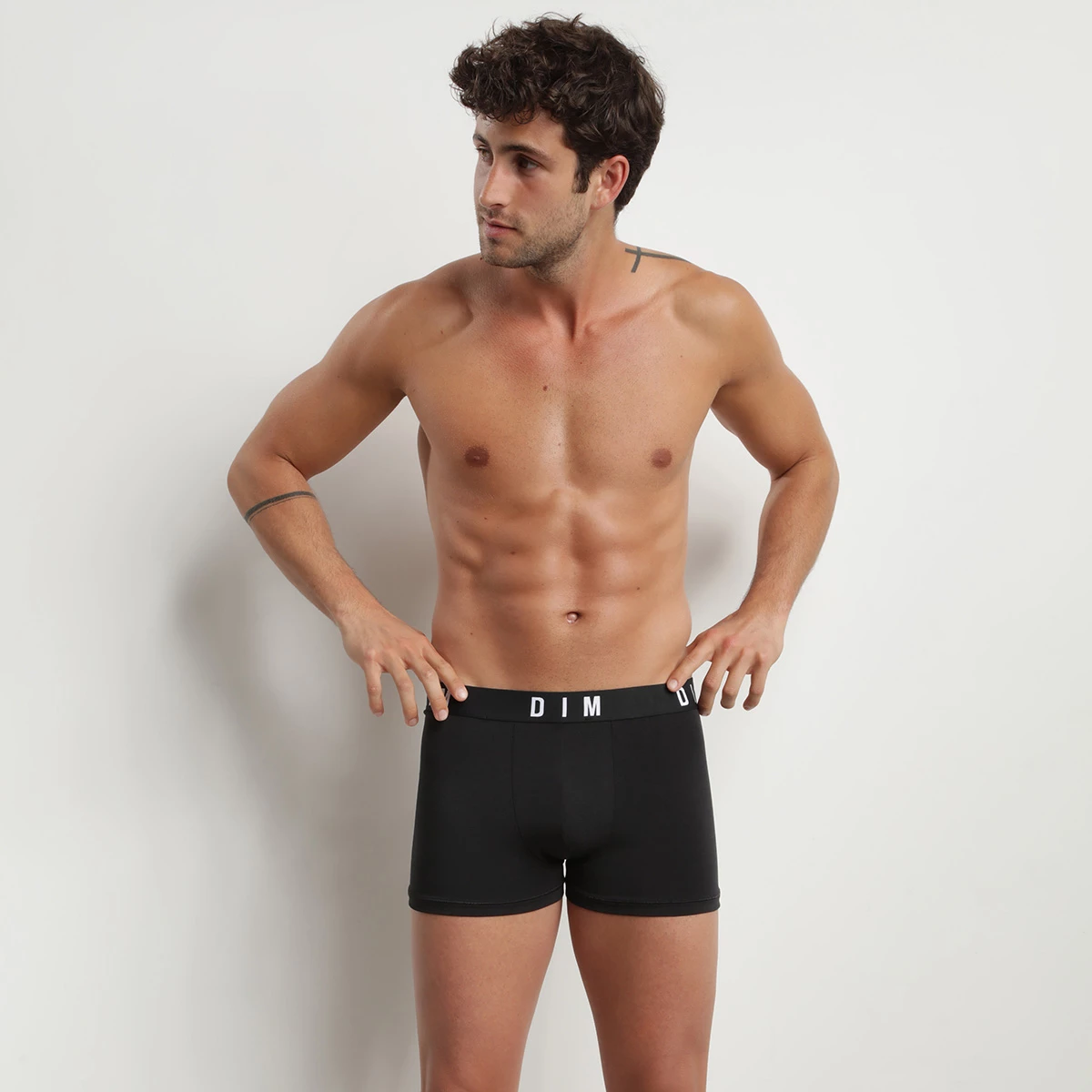 Glissez avec aisance dans ce Boxer homme coton Dim Originals, au corps uni Noir en modal ultra extensible et à la bande de maintien élastique, avec logo Dim blanc au style épuré, pour une taille sobrement marquée et structurée.