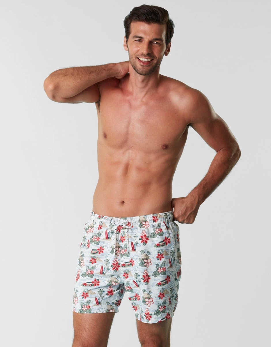 Pratique pour une longue journée au soleil. L’imprimé fleurs et les détails de planche de surf font immédiatement penser à la mer et aux longues baignades.