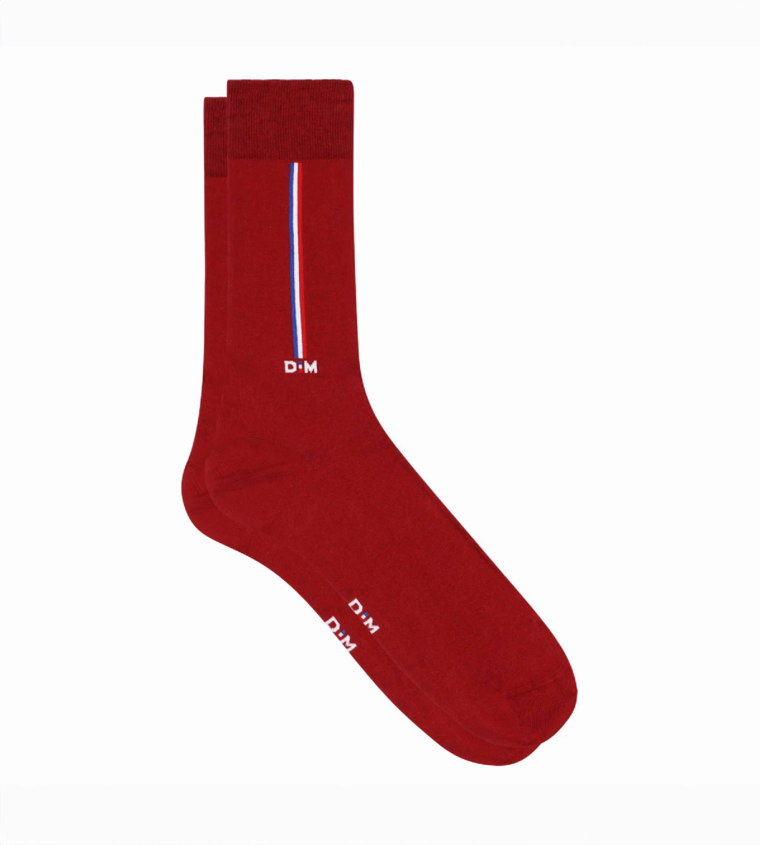 Affichez une allure 100% locale avec notre paire de Chaussettes Made in France Homme en coton peigné Monsieur Dim qui habille votre mollet d’un drapeau tricolore complètement assumé ! En version Bordeaux, votre paire de chaussettes homme est plus charismatique et captivante.