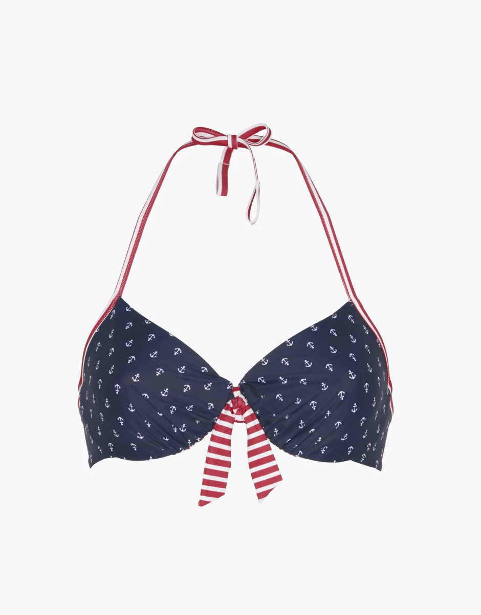 Imprimé ancres ou rayures rouges et blanches ? Ne choisissez pas et adoptez ce haut de maillot de bain réversible : un véritable must pour votre été !