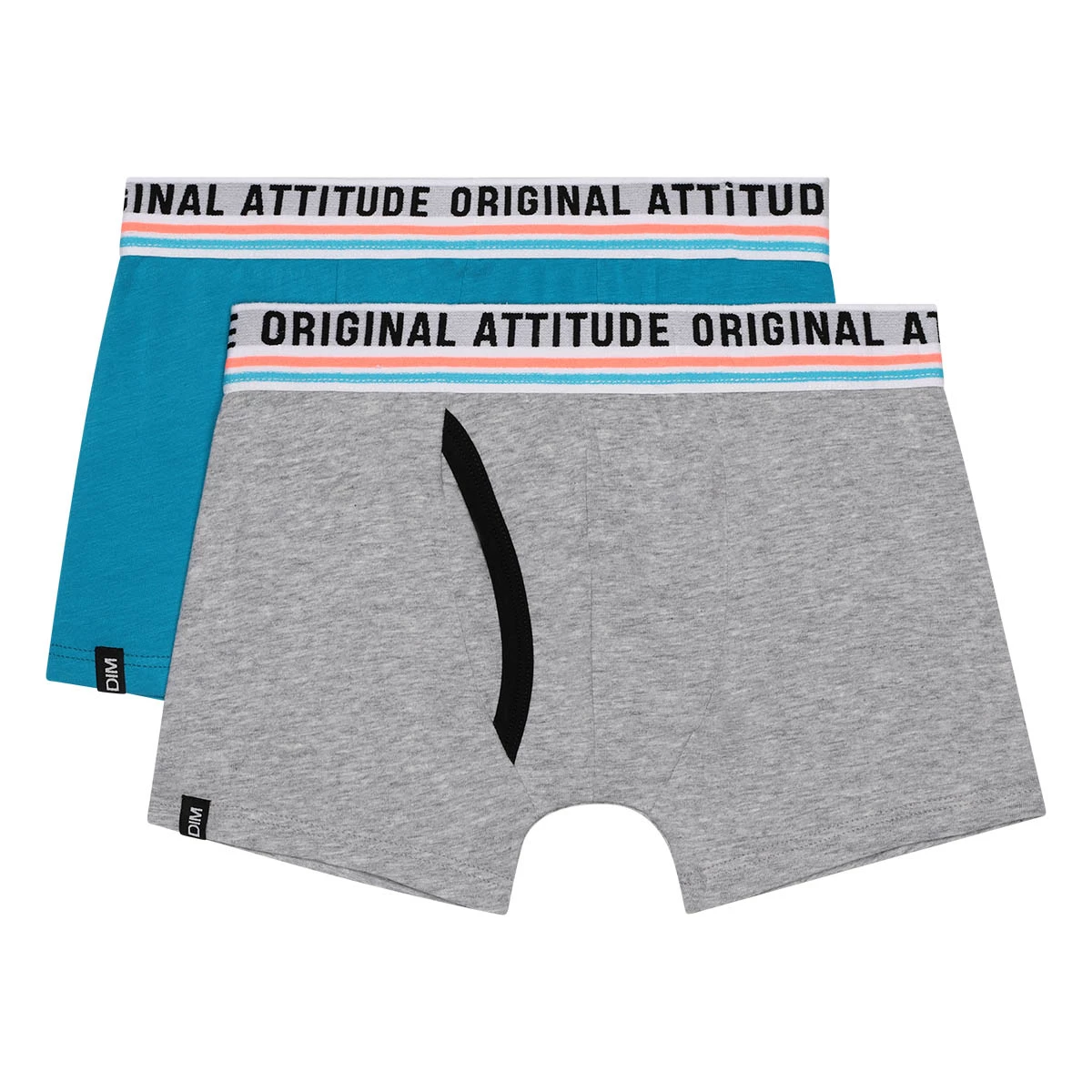 Votre enfant va forcement craquer pour ce lot de deux boxers garçon bleu et gris Dim Original, confort assuré !