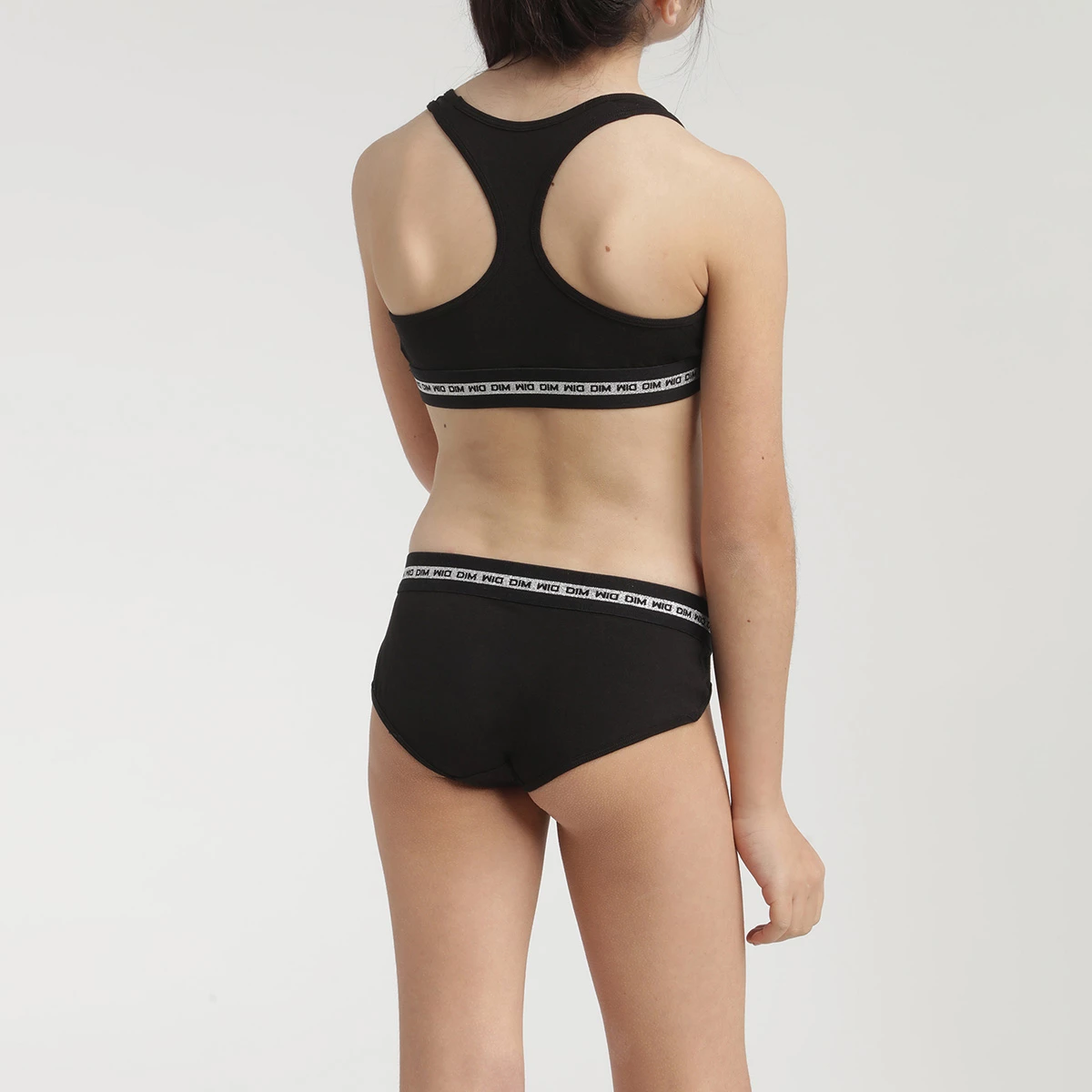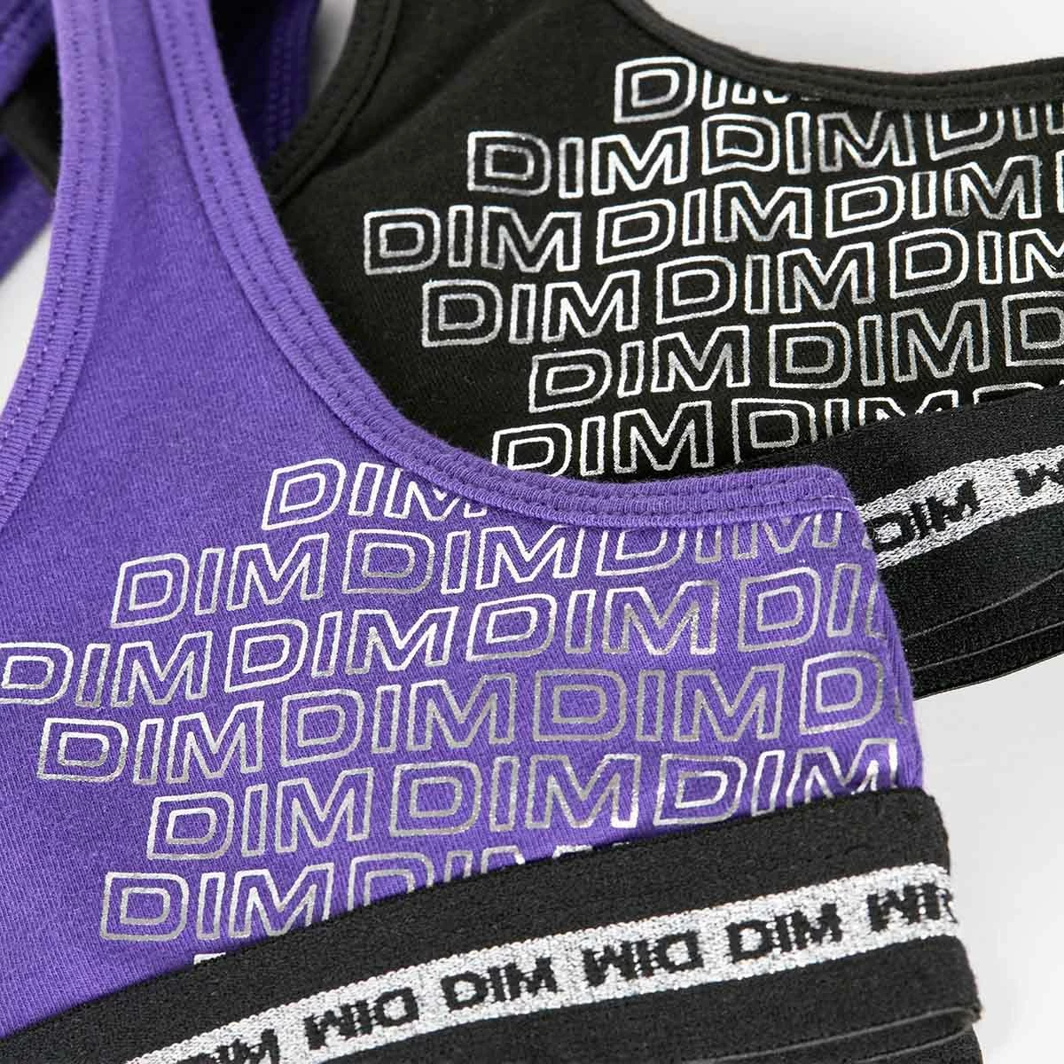 Confort et style assurés avec ce lot de 2 brassières fille en coton stretch Dim Sport aux coloris tendance Violet Noir et aux détails argent captivants !