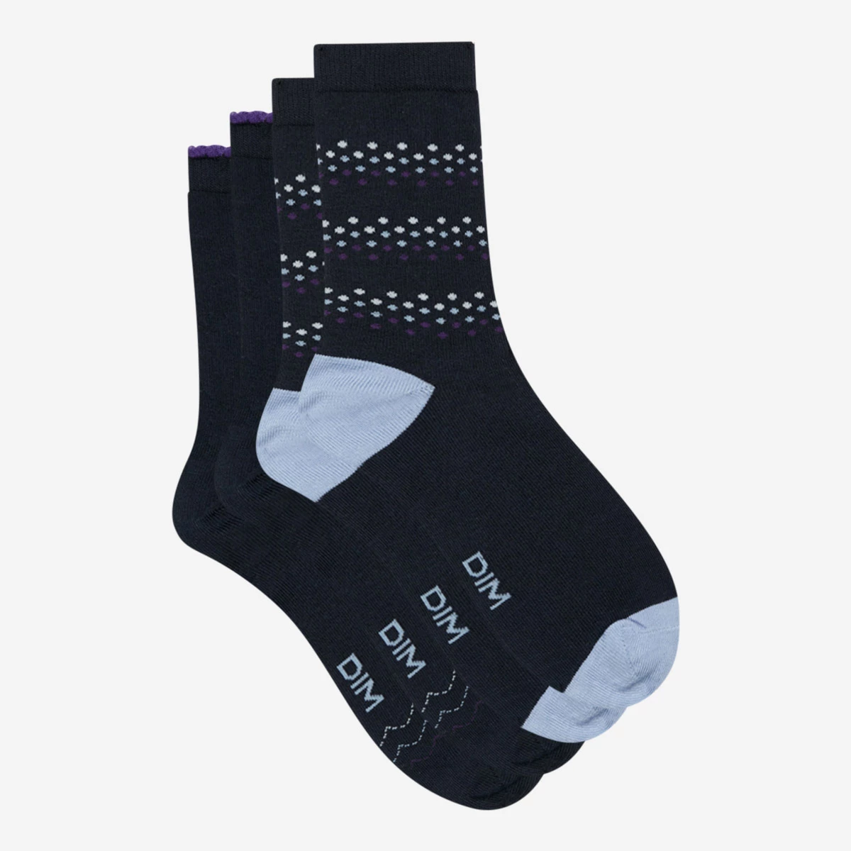 Avec ses tons Bleu Marine intense et Bleu Glacé énergisant, son imprimé petits pois et chevrons nuancés de Violet, ainsi que sa top band festonnée, votre lot de 2 paires de chaussettes montantes Coton Style enveloppe vos pieds avec douceur et envoûtement.