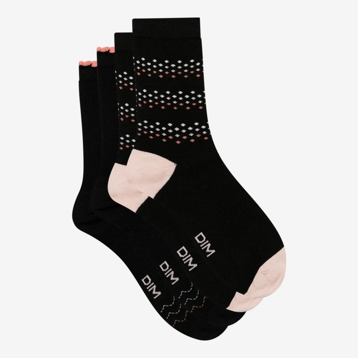 Originalité et sobriété sont de mise avec ce lot de 2 paires de chaussettes femme Coton Style Noir aux impressions géométriques colorées !