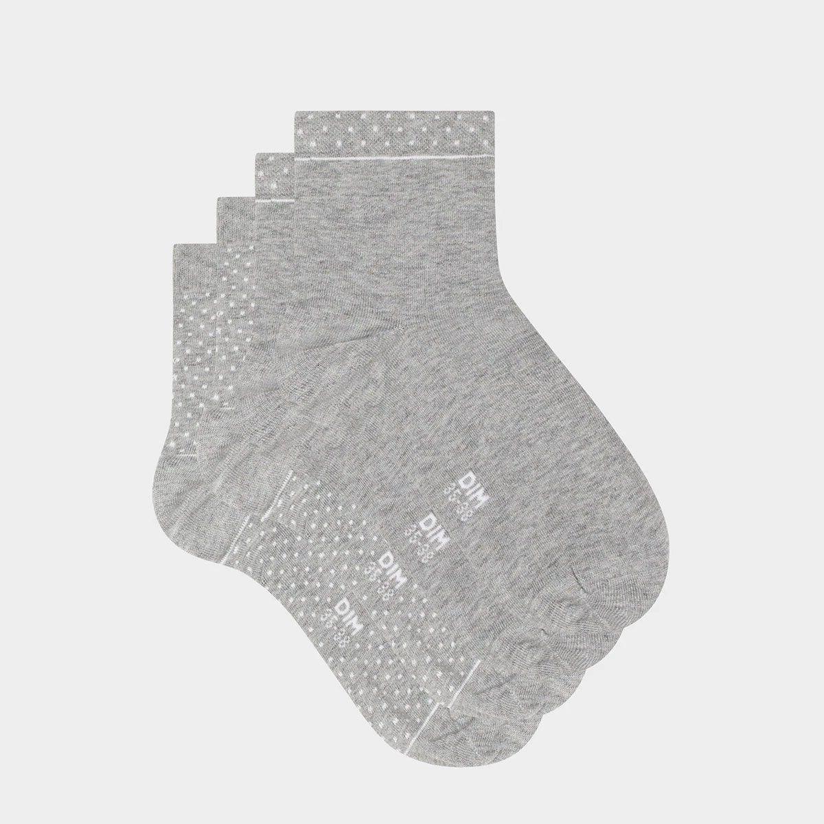 Notre basique green revisité pour une version plus mode et contemporaine ! Éco-conçu dans le respect de l’environnement et des matières, notre lot de chaussettes femme Gris Clair Chiné Green by Dim se compose d’une paire unie avec un bord-côte décoré de pois et d’une socquette recouverte de ce motif, pour une touche discrètement couture !