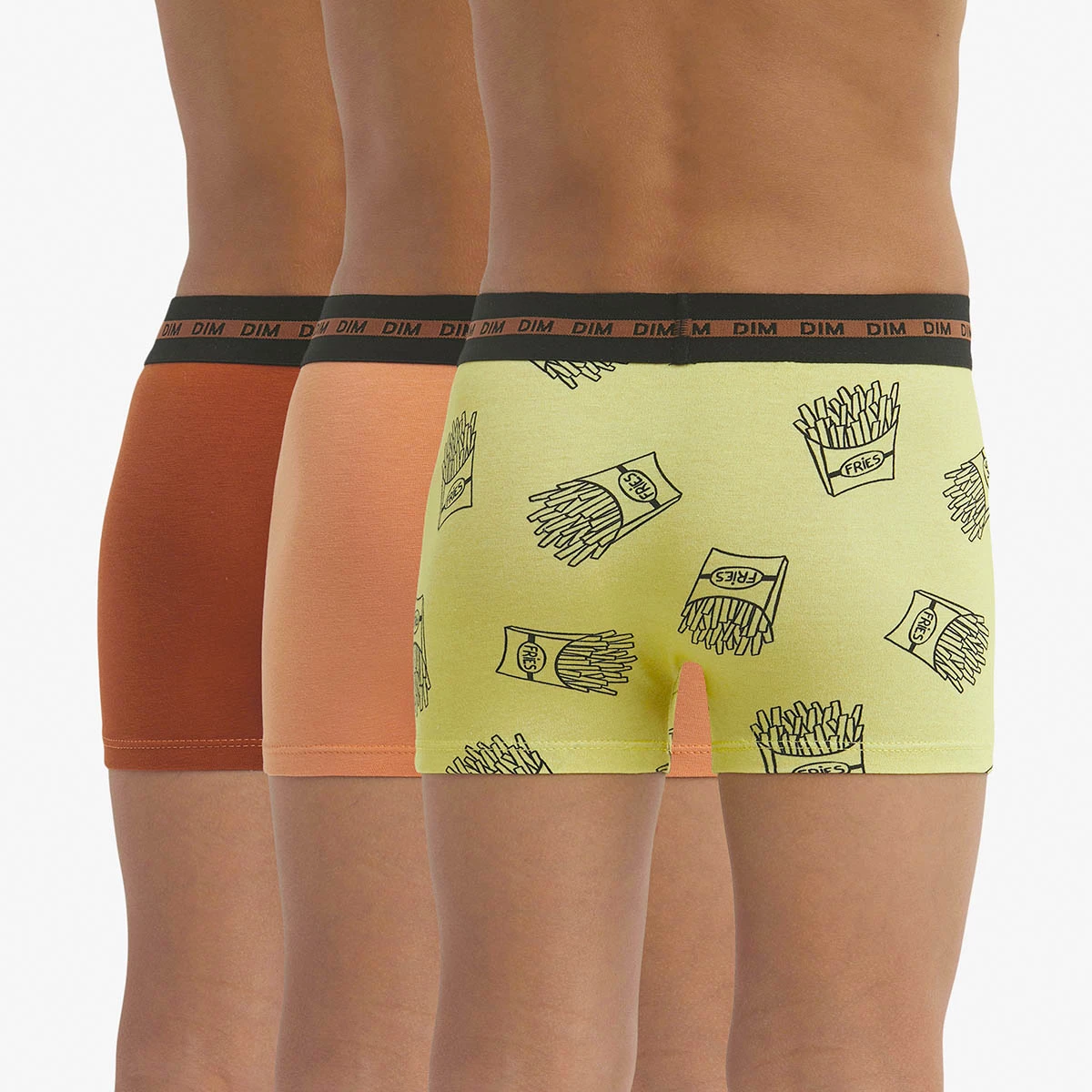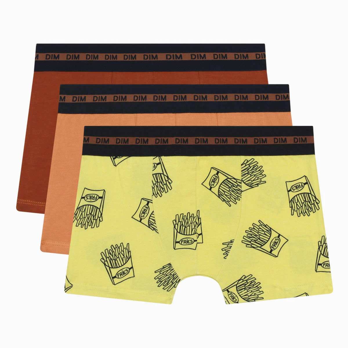 Votre ado craque pour ce lot de 3 Sous-Vêtements pour Garçon EcoDim Mode aux nuances chaudes Orange, Terre Cuite et Jaune, et aux illustrations insolites en forme de sachet de frites, à consommer sans modération pour une allure branchée et fun !