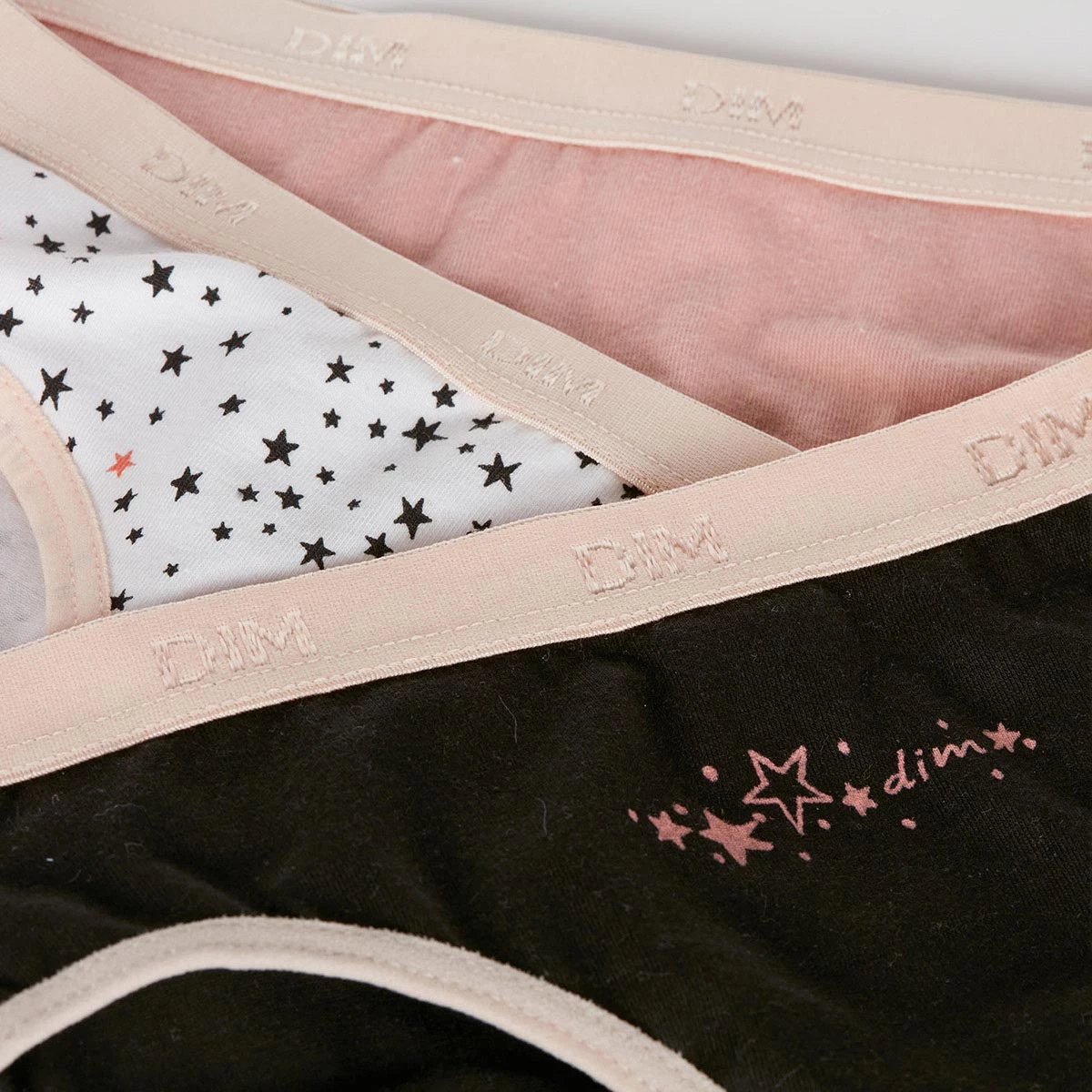 Le lot de 3 culottes filles Dim Les Pockets en coton stretch Noir, Rose, Blanc avec motif étoilé complète leurs tenues avec une touche légèrement Rock !