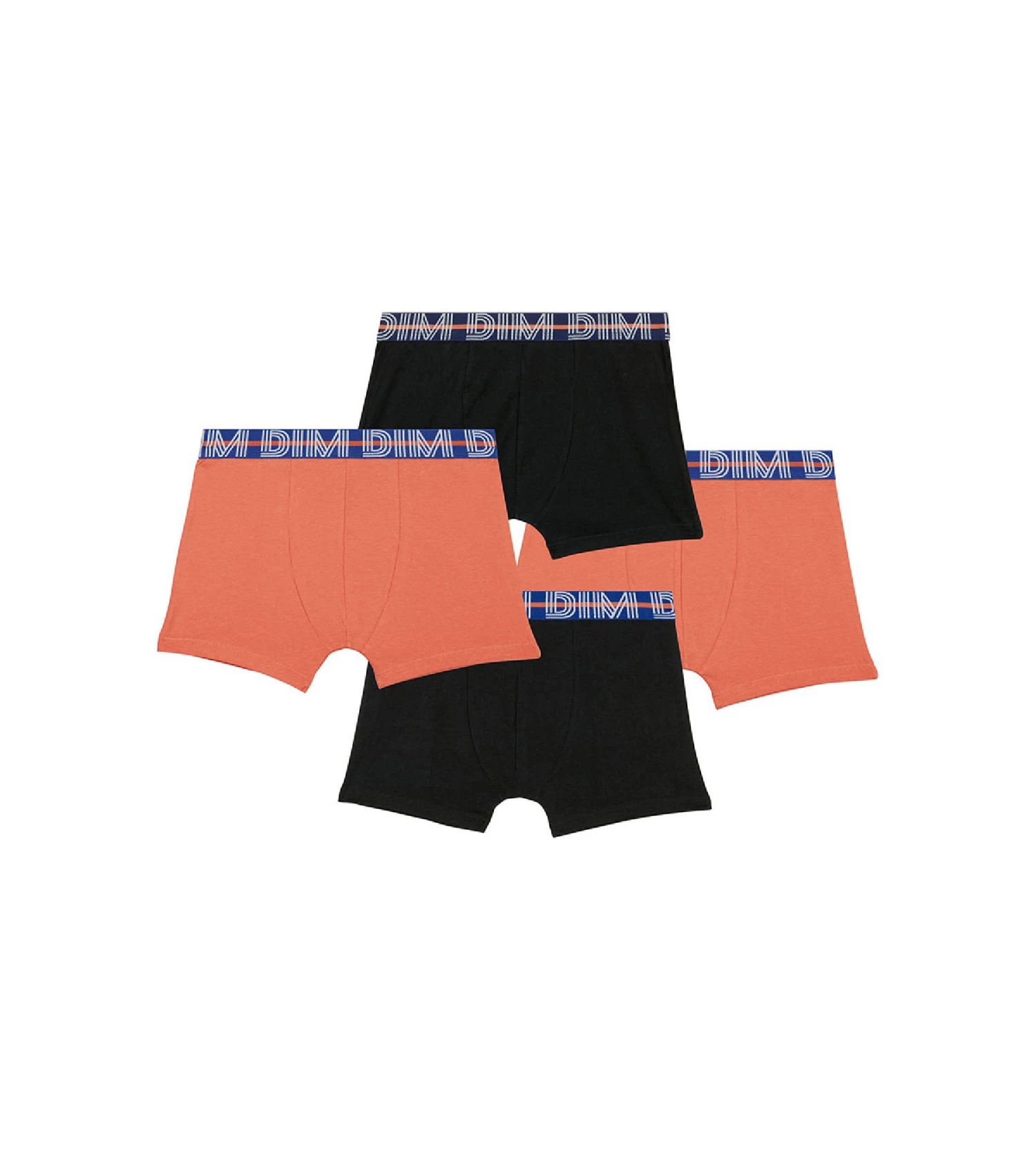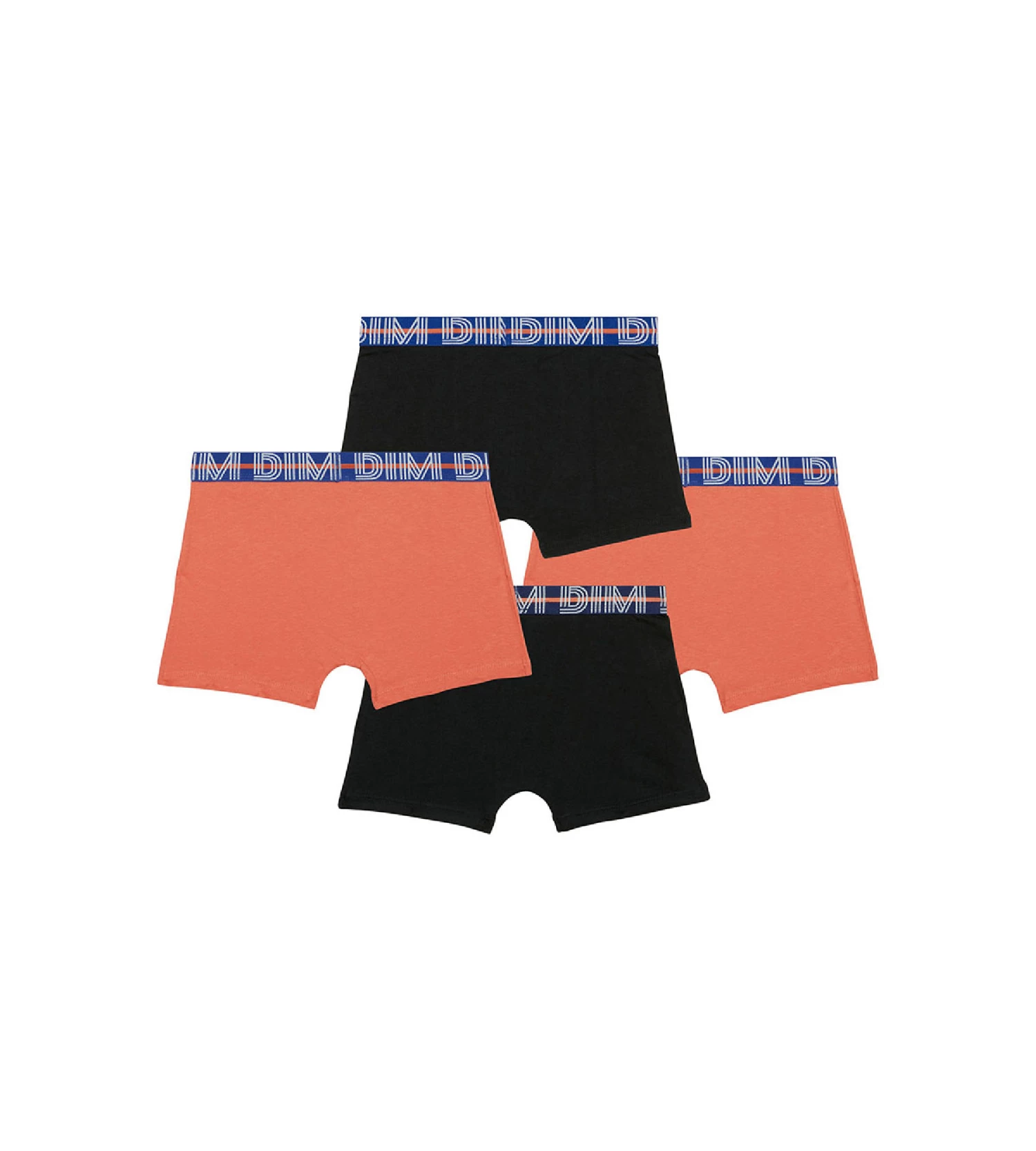Constitué de 2 sous-vêtements ado noirs avec bande de maintien bleue et de 2 boxers enfant Orange avec ceinture Bleu Marine, votre pack de 4 dessous EcoDim est moderne et intemporel ! On adore le logo Dim XL souligné d’une bande Orange vive, trop stylé !