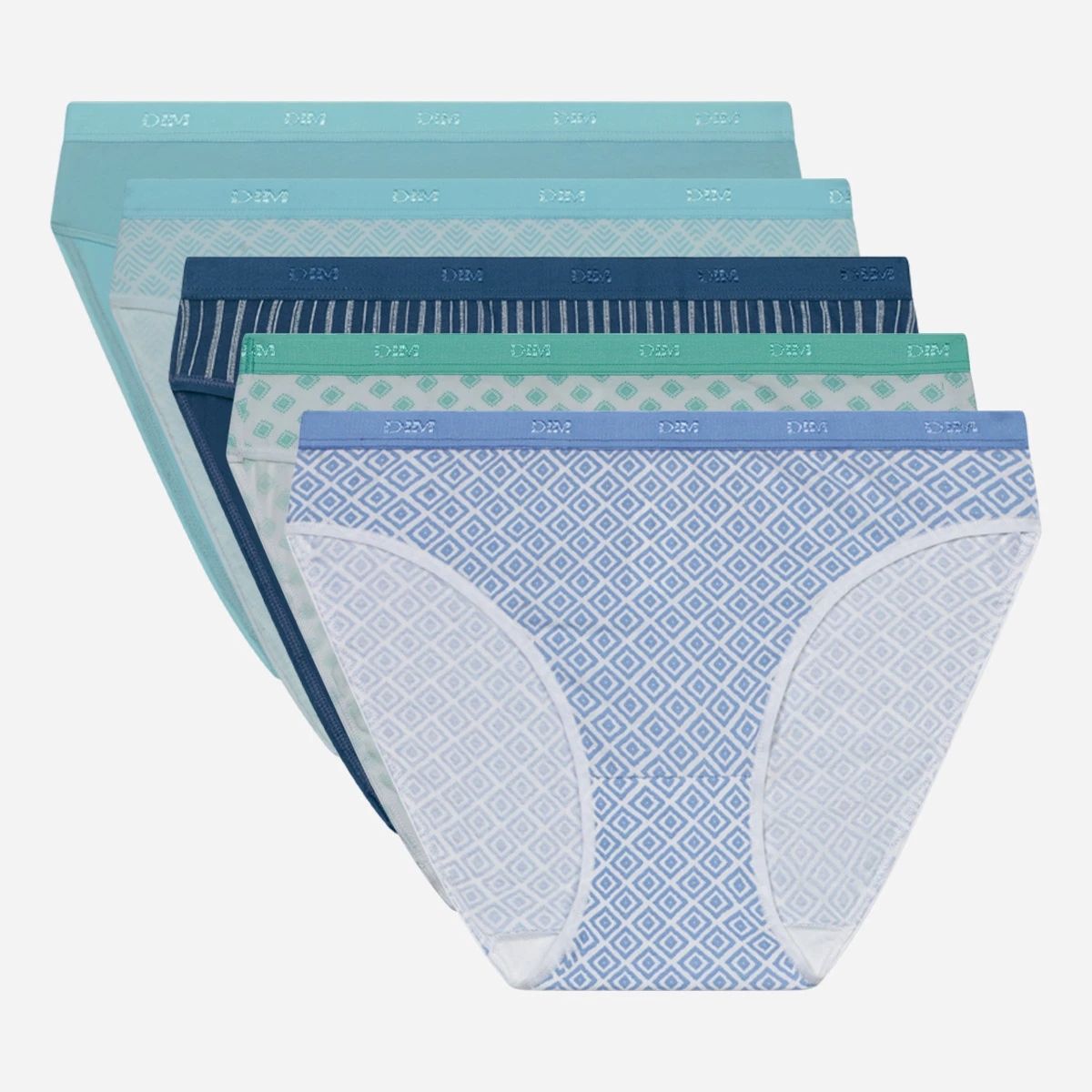 Coup de coeur pour ce lot de 5 Slips Femme Les Pockets, à la fois économique et stylé ! Constitué d’un slip Blanc à carrés Bleus, d’un slip femme Blanc à losanges Verts, d’une culotte coton Bleu Denim aux lignes irrégulières, d’une culotte femme ornée de petits traits Turquoise et d’un dernier slip dim femme uni Turquoise, notre assortiment de Sous-vêtements Coton Les Pockets rythme vos journées avec exotisme !