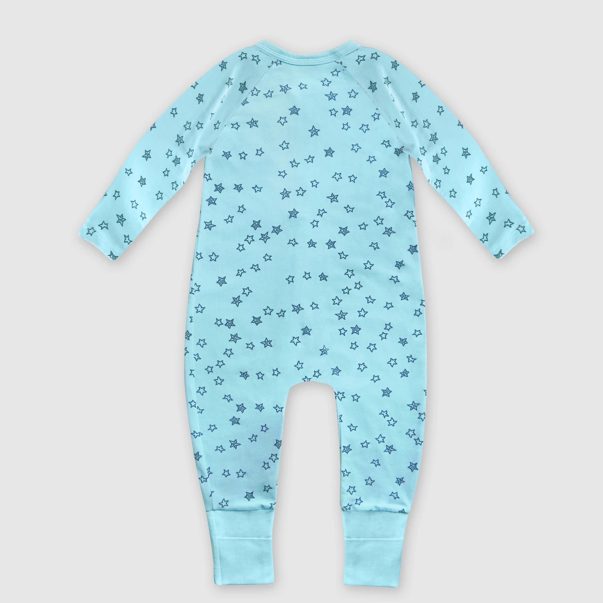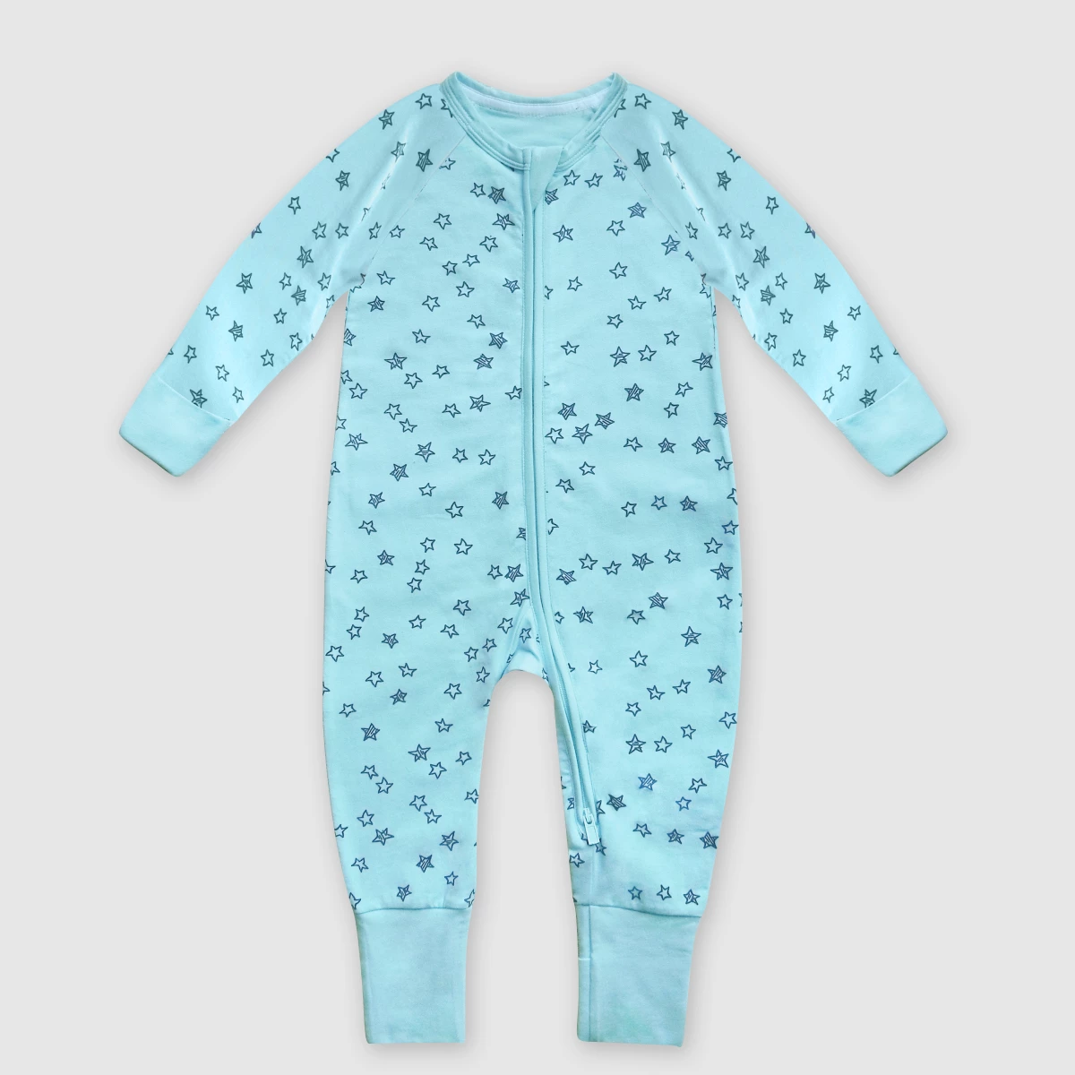 Misez sur le confort avec le pyjama bébé zippé en coton stretch bleu clair imprimé pluie d’étoile Dim ZIPPY ® !