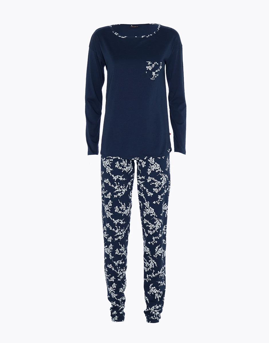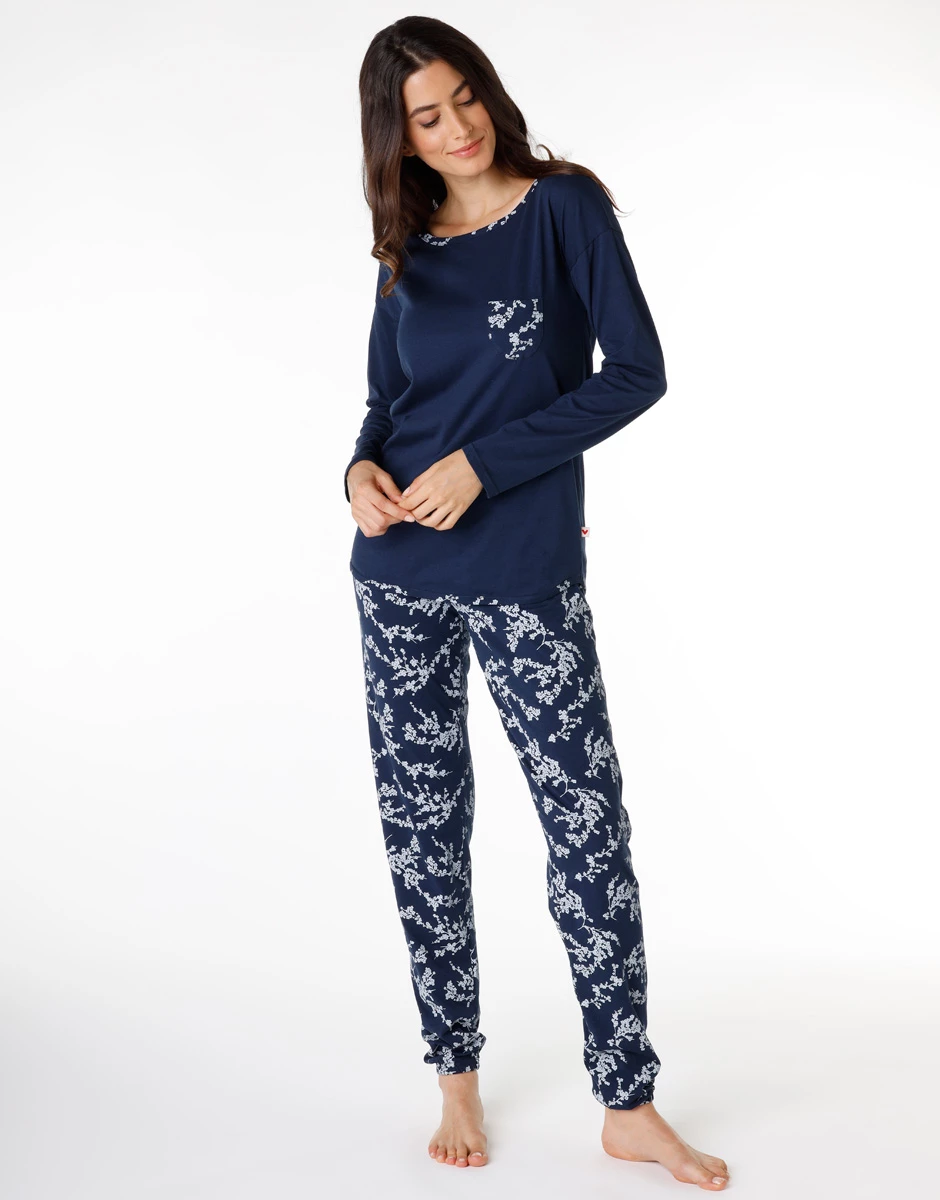 Pantalon et tunique à manches longues dans les tons bleus. La tunique en bleu uni possède une poche avec un imprimé fleuri blanc. Cette impression est également présente sur le col rond. Le pantalon qui a un revers en bas de jambe a un imprimé fleuri blanc. Le tissu jersey 100% coton rend le vêtement chaud et donc agréable à porter et doux au toucher. Il permet également une grande liberté de mouvement car il ne se resserre pas.