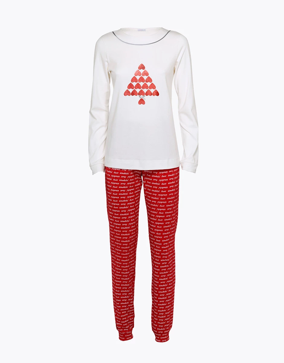 Alors ce pyjama est fait pour vous ! Pyjama à manches et pantalon long. Composé d’une tunique fermée à col rond, caractérisée par la couleur ivoire avec un imprimé arbre composé de cœurs rouges. Le passepoil est de couleur contrastante au niveau du cou. Le pantalon a des revers au bas de la jambe et se caractérise par une couleur rouge et un imprimé intégral. Le tissu en coton rend le vêtement de nuit doux, chaud et élastique afin de rendre le pantalon agréable à porter. Disponible dans les tailles XS à XL.