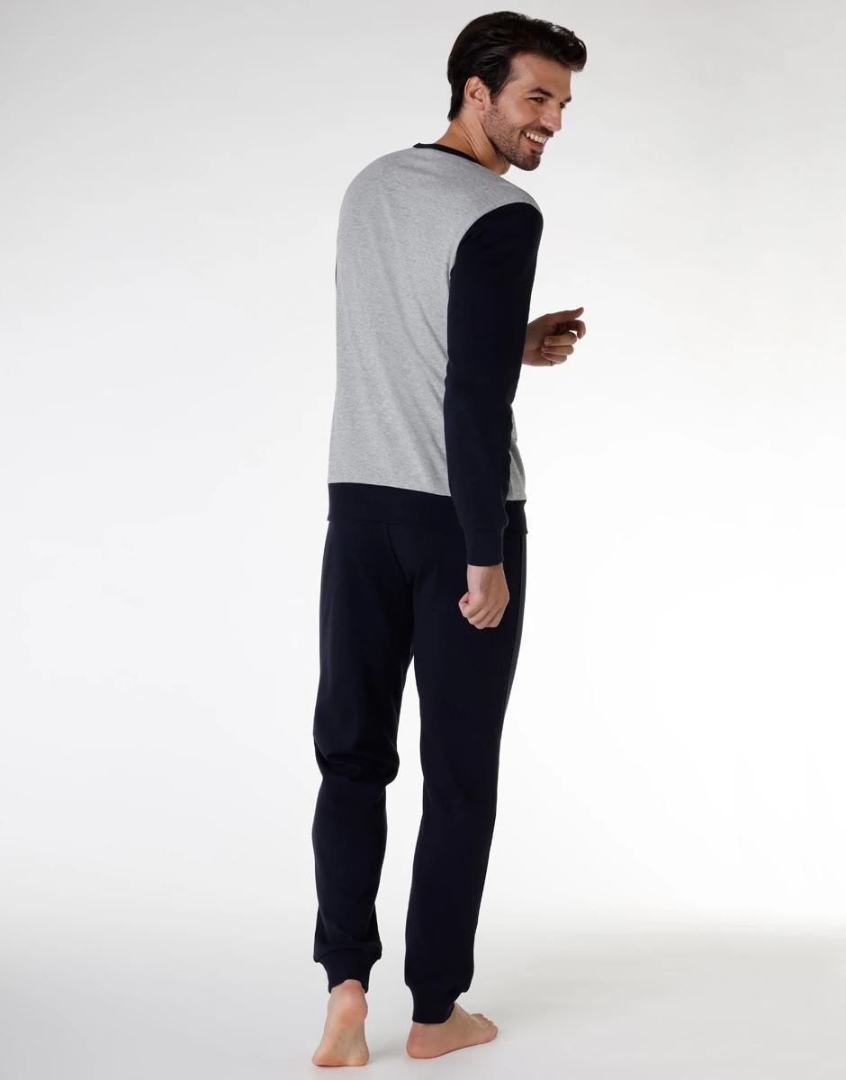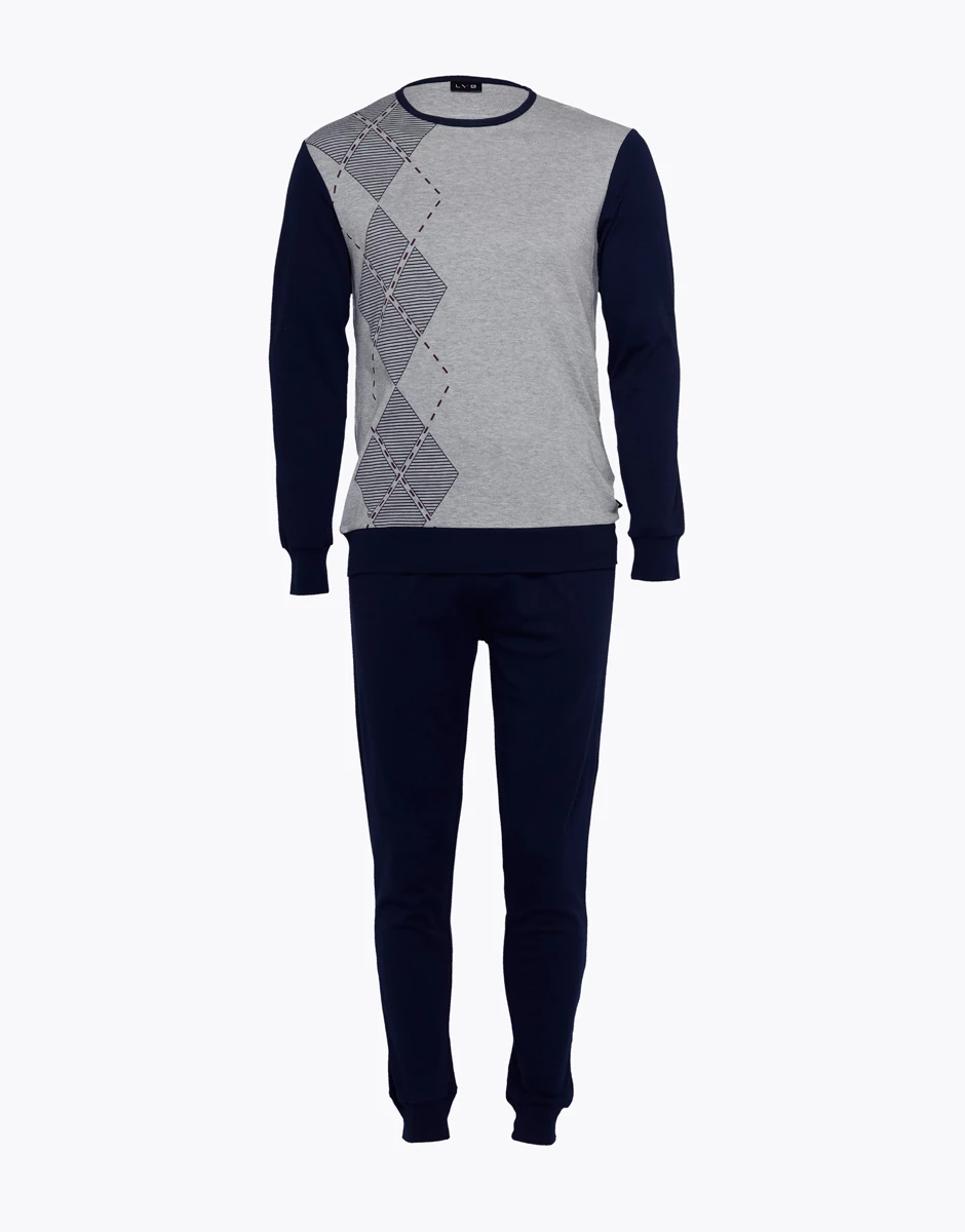 Vous aimez les motifs géométriques ? Alors vous allez vous régaler ! Cet ensemble de pyjama long pour homme comprend une tunique à manches longues, des poignets et un col ras du cou bleu marine. Sur le devant, la tunique est peinte en gris mélangé avec un motif géométrique de losanges. Le pantalon long, quant à lui, est bleu marine et comporte un revers en bas. Le tissu est fait de coton interlock, de sorte que lorsqu’il est porté, il dégage une sensation de chaleur confortable.