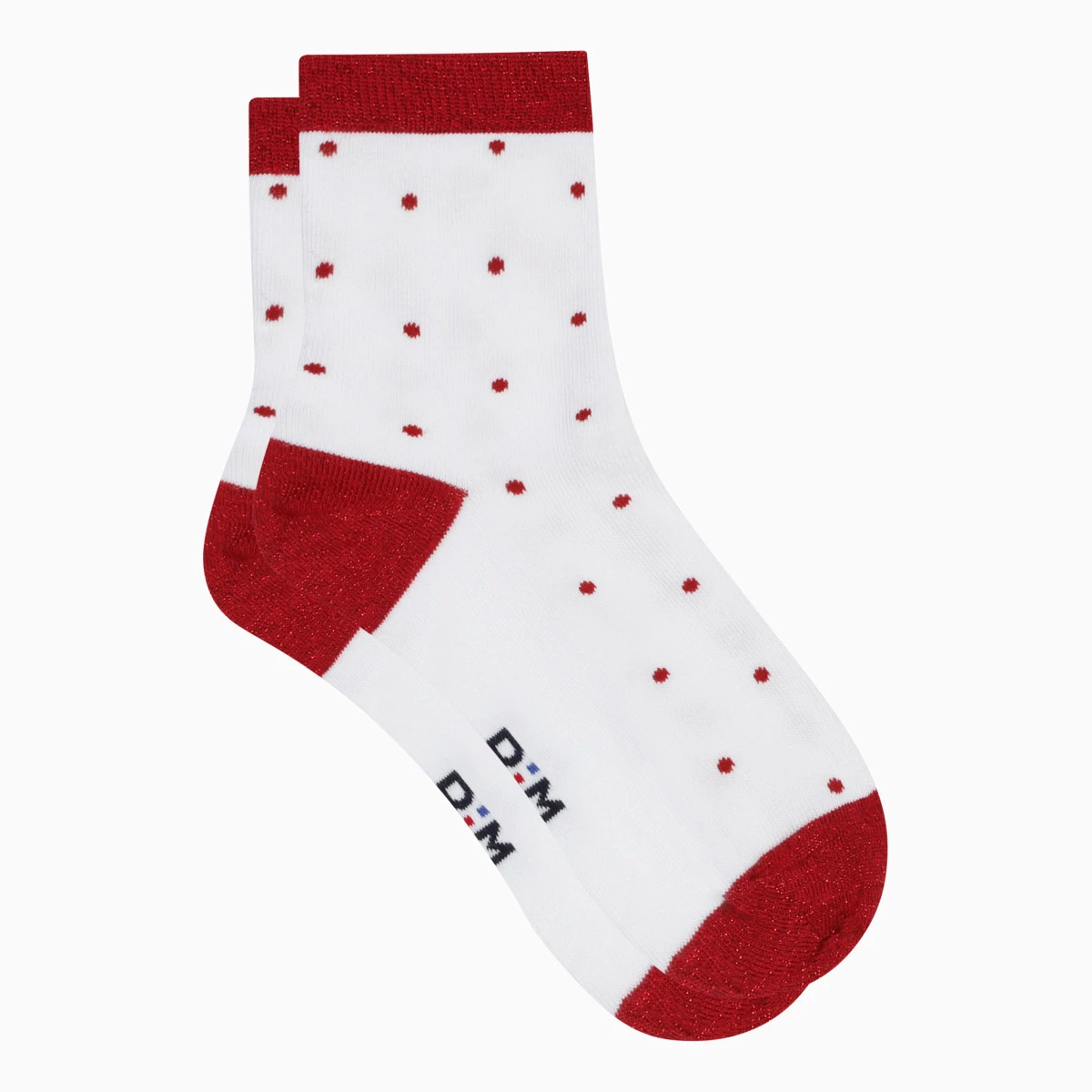 Rythmez vos tenues avec sophistication grâce à notre paire de socquettes femme Madame Dim en Lurex Blanc et pois Framboise, très preppy !