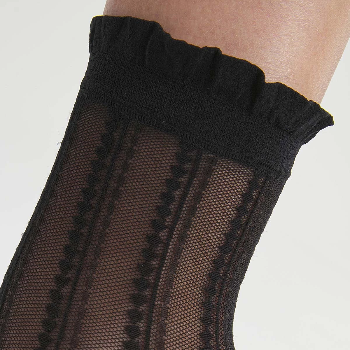 Apportez une touche pointue à vos looks avec notre paire de socquettes femme en voile transparent Noir Dim Style à rayures graphiques très design !