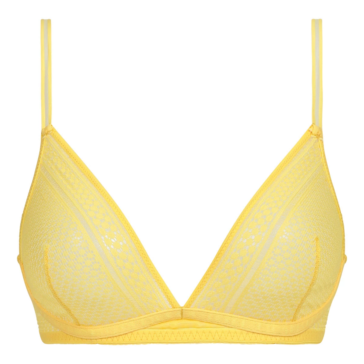 Craquez pour le style radieux de notre soutien-gorge triangle sans armature Chic Summer à bonnets modulables et dentelle graphique Jaune, ultra ensoleillée !